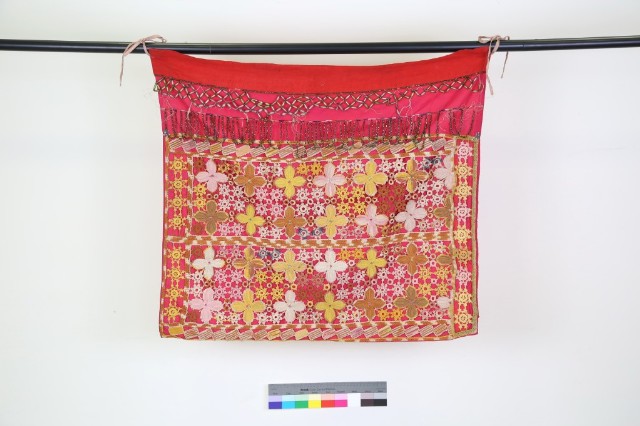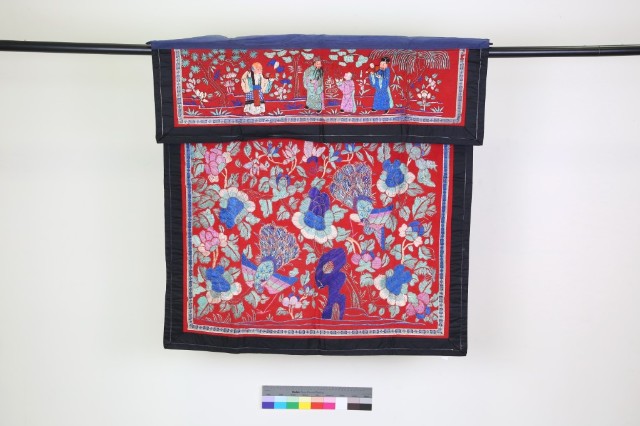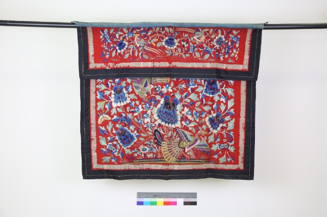紅綢地鑲黑邊彩繡三仙花鳥紋桌圍