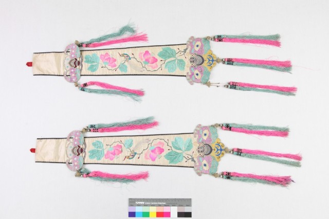 橙黃綢地彩繡雙雀朝牡丹劍帶-1