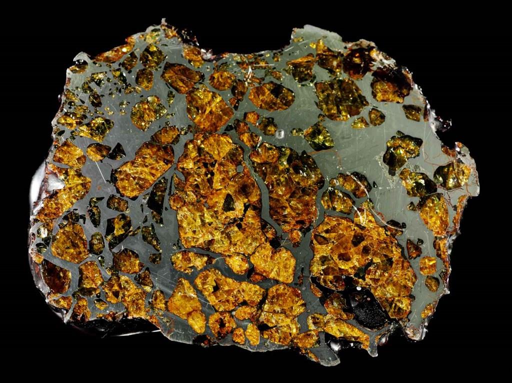 This sample clearly shows two components with sub-equal proportions; the dark gray portion with metal luster and the yellowish silicate portion. It is therefore a stony iron meteorite. Upon cooling of meteorites, crystallization occurs resulting in fractionation. Stony iron meteorites are products at the interface of metal and silicate phases. This explains their scarcity. (Huai-Jen Yang)