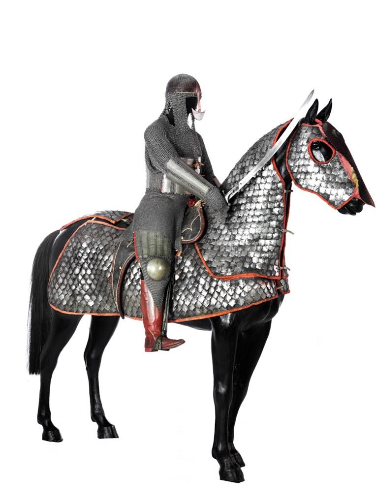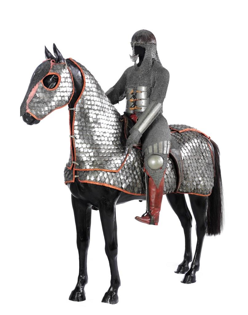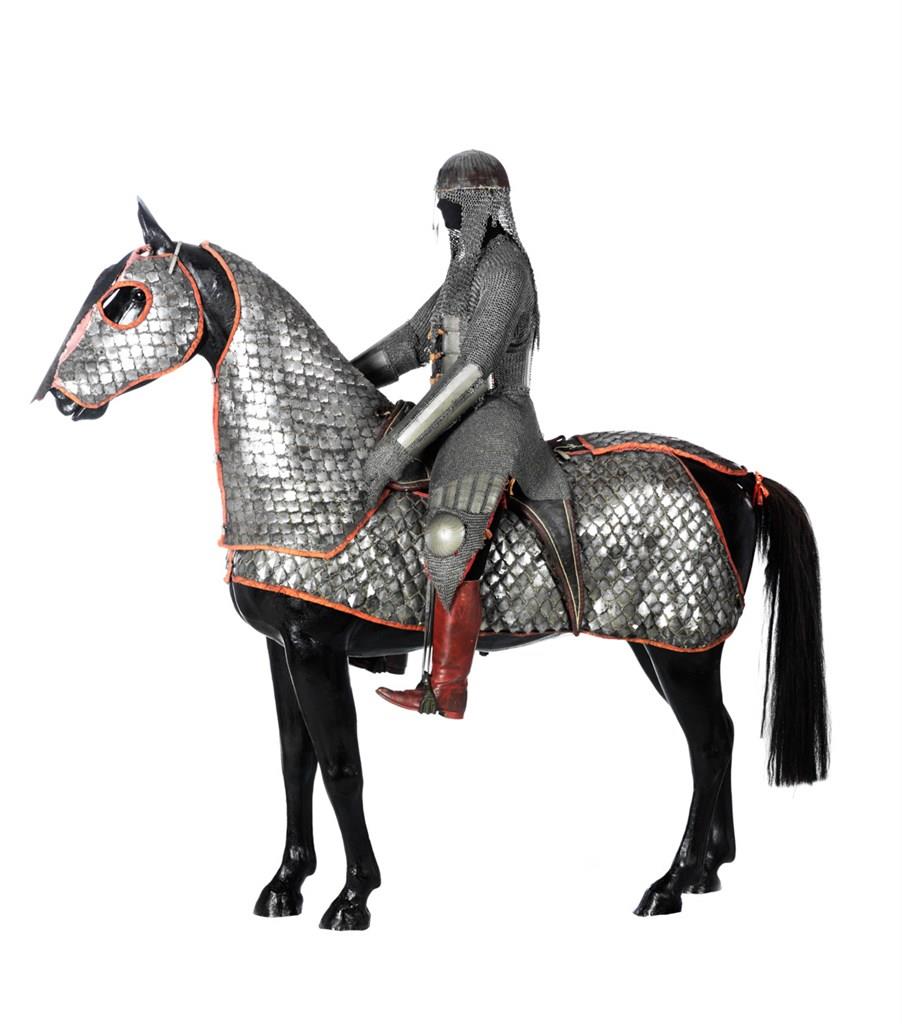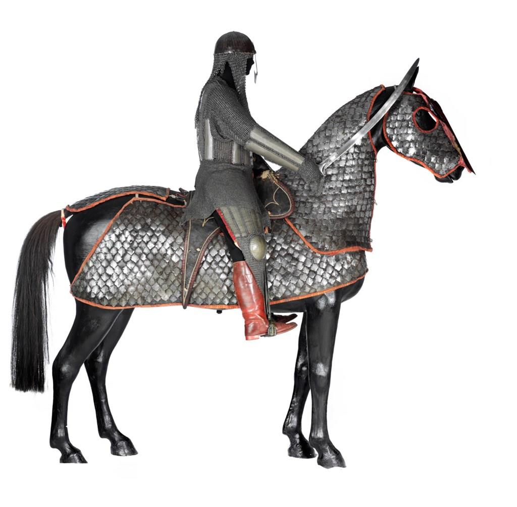 The armour for the man is dated 1691 and is inscribed to the Mughal general Anup Singh. It is constructed of a mixture of mail (a group of small links fitted together) and plate armour. It is very rare and together with a similar armour in the Metropolitan Museum of Art in New York, which bears a similar inscription. It is one of the earliest recorded dated Indian armour still existing. It is similar in form to other armours that were in use from 1560–1630, and it is therefore probably older than the date marked on it.