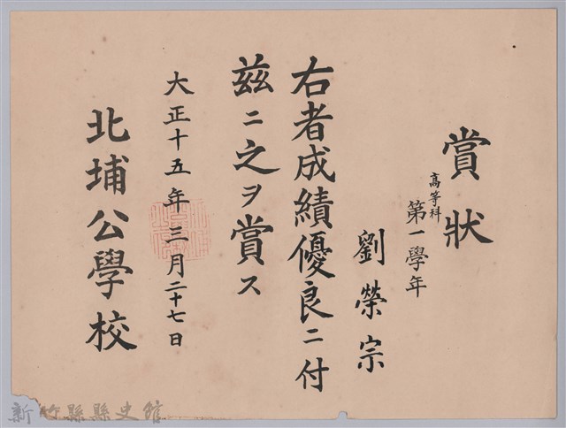 大正十五年北埔公學校頒予劉榮宗賞狀