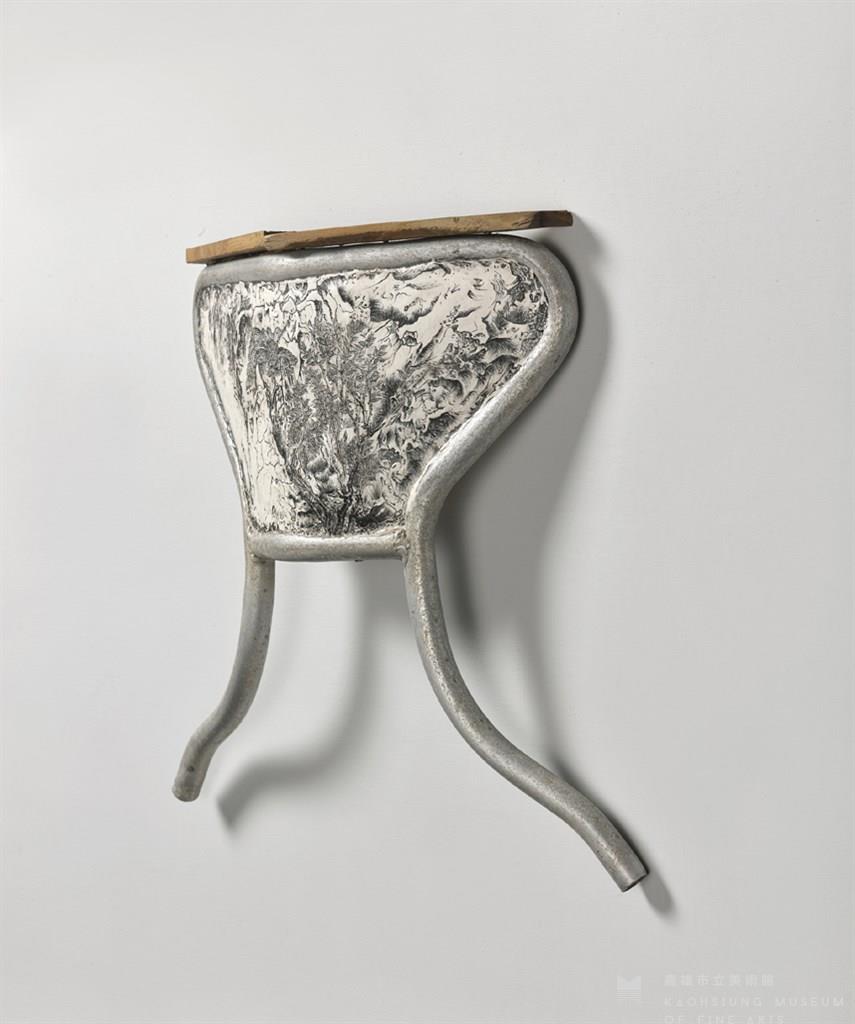 Paper pulp, resin, aluminum, wood, acrylic and found object