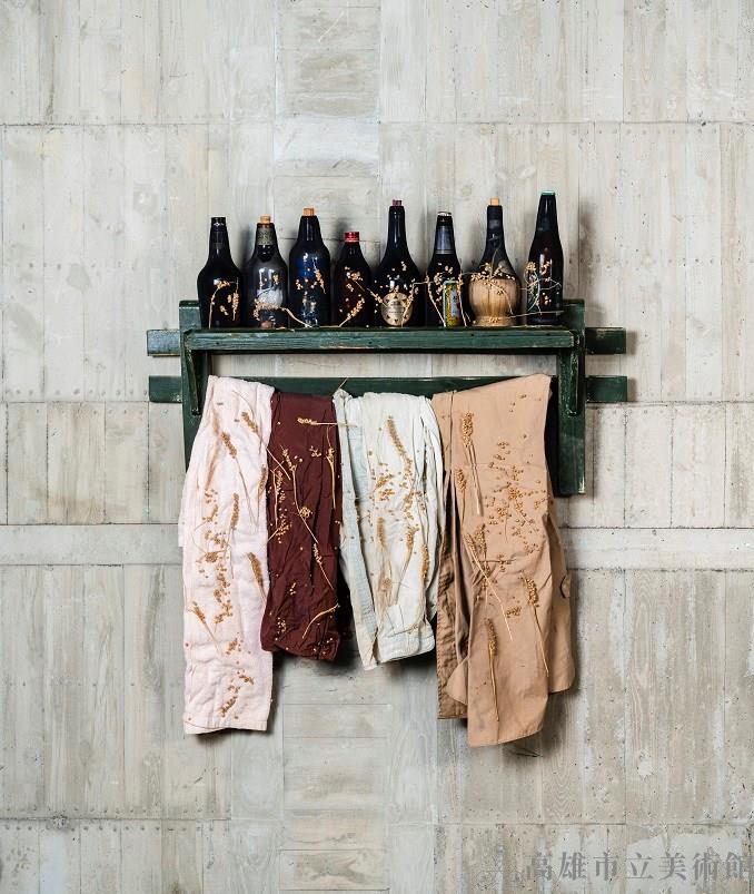 Bottle, stockings, wood, clothing and tribulus seeds