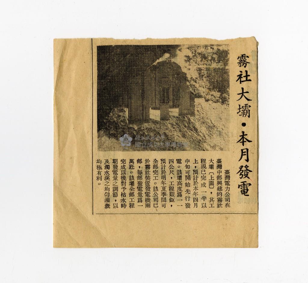 〈霧社大壩‧本月發電〉剪報