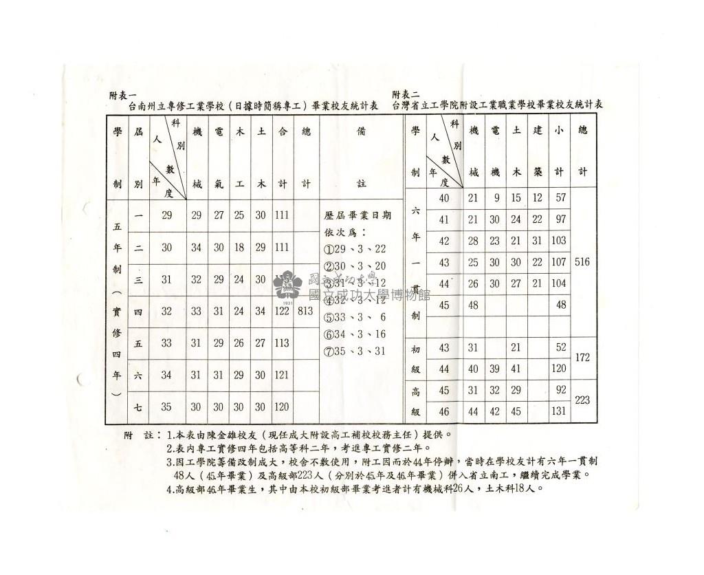 The statistics of graduates of Tainan Prefecture Industrial Secondary School and The Affiliated Industrial Vocational High School of Taiwan Provincial Institute of Technology