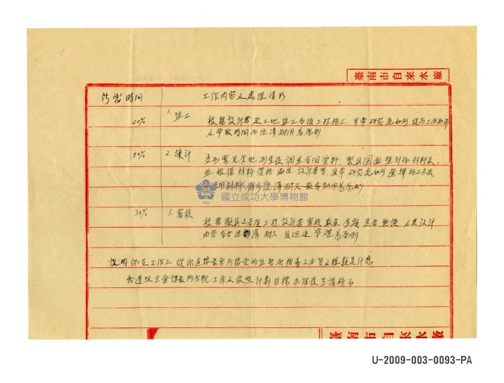 Working content process record of Tainan city water plant