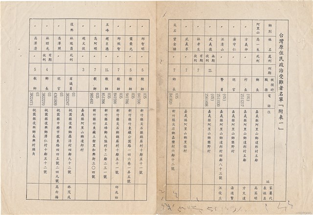 台灣原住民政治受難者名單「附表一」