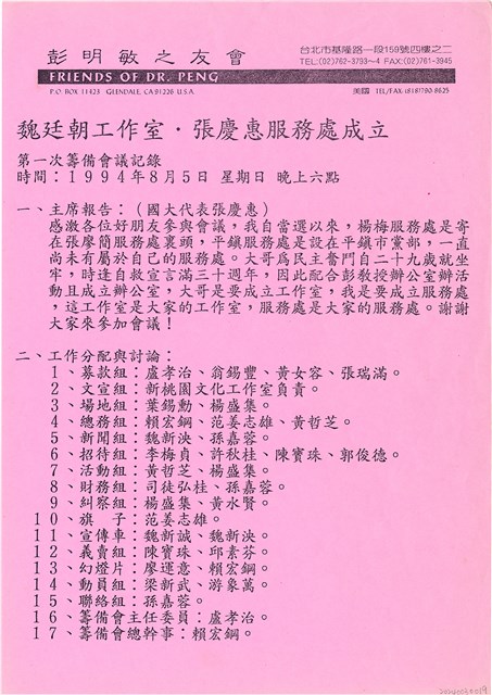 彭明敏之友會「魏廷朝工作室・張慶惠服務處成立」第一次籌備會議紀錄(1994年8月5日)