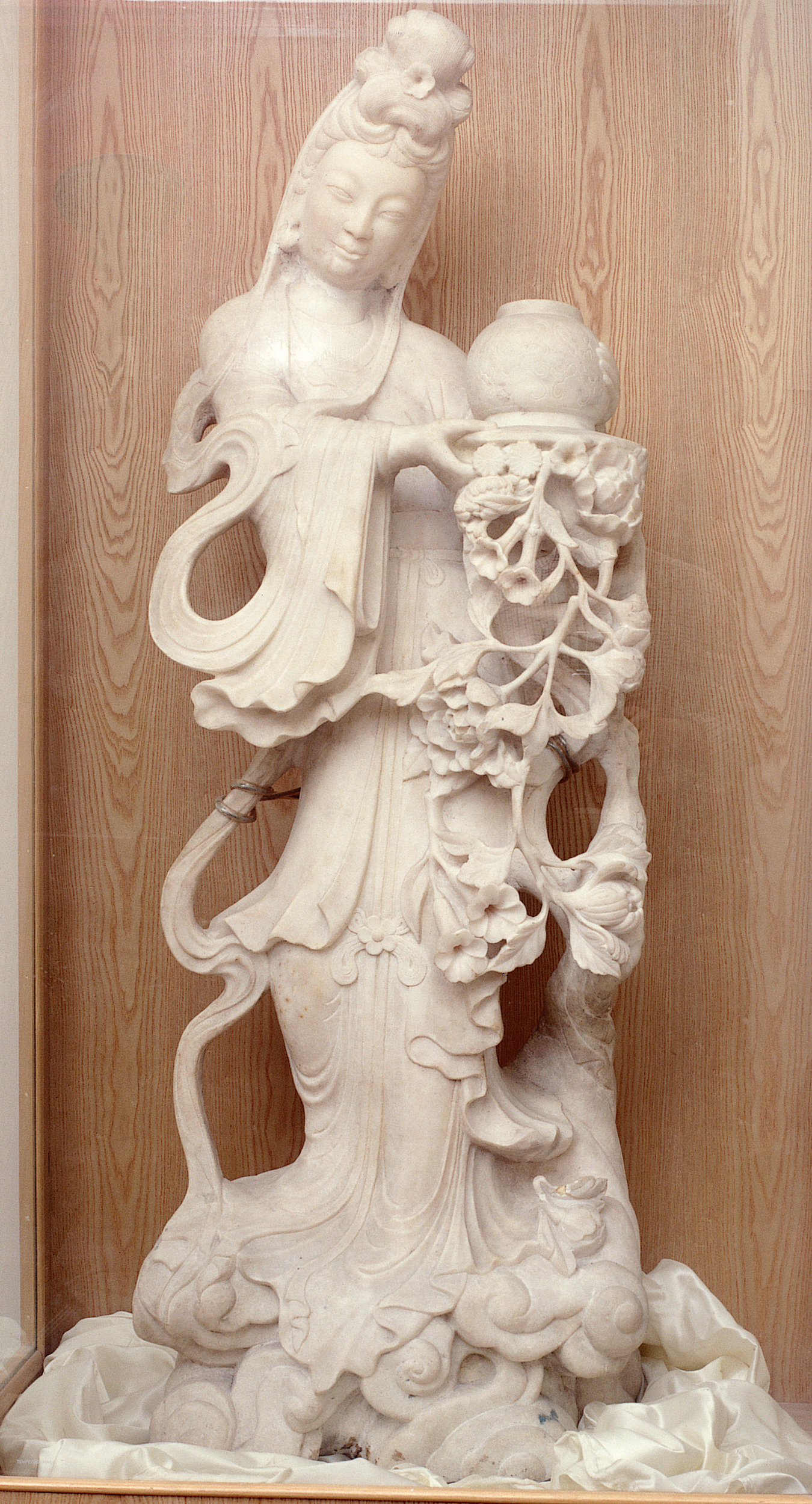 國立歷史博物館藏《石雕天女散花》(館藏編號07031)天女散花源出佛典《維摩經·觀眾生品》:“時維摩詰室有一天女,見諸大人聞所說說法,便現其身,即以天華散諸菩薩、大弟子上,華至諸菩薩即皆墮落,至大弟子便著不墮。一切弟子神力去華,不能令去”。「天女散花」本為佛測驗諸菩薩和聲聞弟子的道行是否已完全斷絕一切慾念的方法,花至菩薩身上即落去,至弟子身上則不落。所謂「花不著者,已斷一切」。此雕像全用華北地區所產白石為材,質地瑩潔,神態安嫻,頗有一種莊嚴感,菩薩天衣瓔珞造型立體繁複,圖右邊天花繽紛而落,巧妙的呈現天花無法著菩薩衣的模樣。一般流行的天女散花多形容抛灑東西或大雪紛飛的樣子,此像更符合佛經之原意。