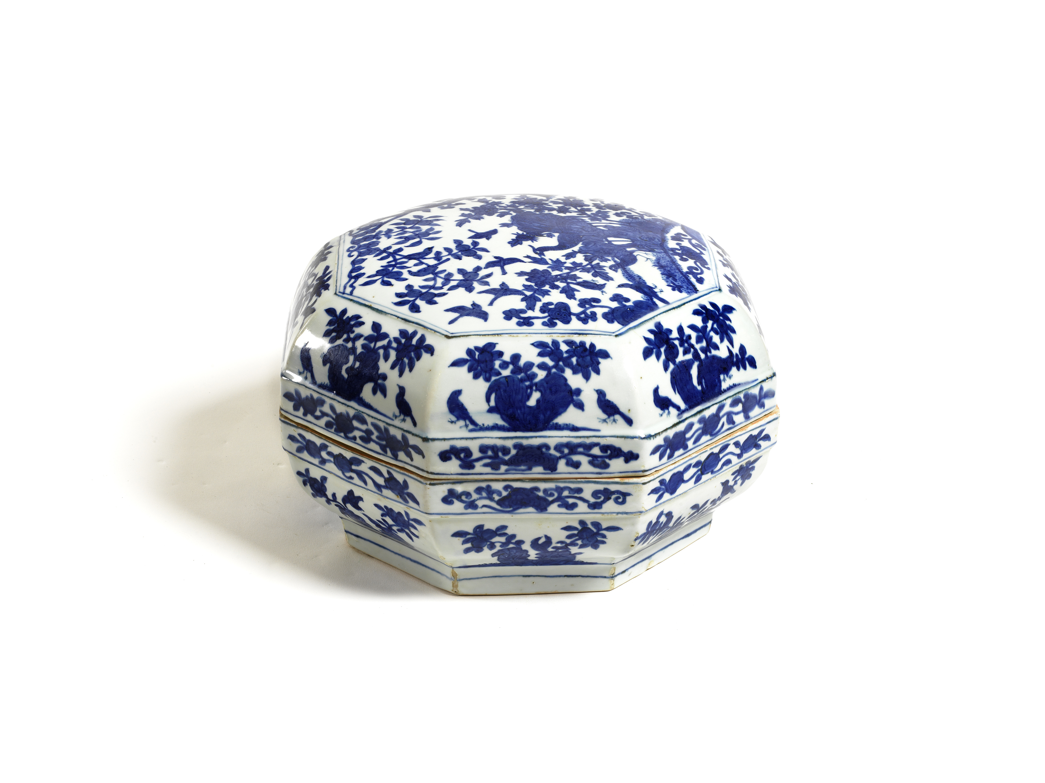 「青花」瓷器是在瓷胎上用鈷料描繪紋飾,再施一層透明釉後以高溫燒造而成。最晚在十四世紀的元代中國,江西景德鎮已成功燒製出青花瓷器,而後盛行於明清。瓷盒是明代嘉靖、萬曆朝常見器形之一,有方形、八角形、銀錠形、鏤空器等,樣式繁多。由於嘉靖皇帝道教信仰關係,瓷器上也常見永壽求仙有關題材的紋飾。本件有款八角蓋盒具有重要時代特色,器形大,造型特殊,工藝技術表現佳,本館於1991年購藏,2010年經文化部指定為重要古物。