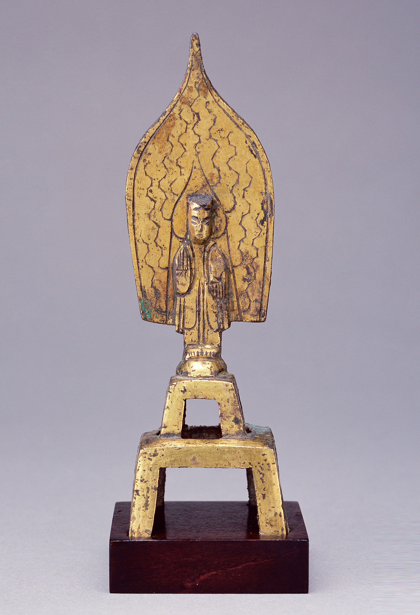 國立歷史博物館藏《鎏金佛》(館藏編號100-00058),本館於2011年入藏。此佛像為鎏金工藝所製作,下方有雙層方形底座,佛像站立於底座之上,造型樸實。鎏金佛像多用銅或青銅鑄造,表面鎏金、可移動之造像,工藝技術越趨精緻的發展之下,佛像也極具藝術性,鎏金又稱黃塗、金塗、火鍍金,為一種金屬加工工藝,以金和汞混和為製造原料,在金屬表面加上一層金層,可增加金屬器的觀賞效果。