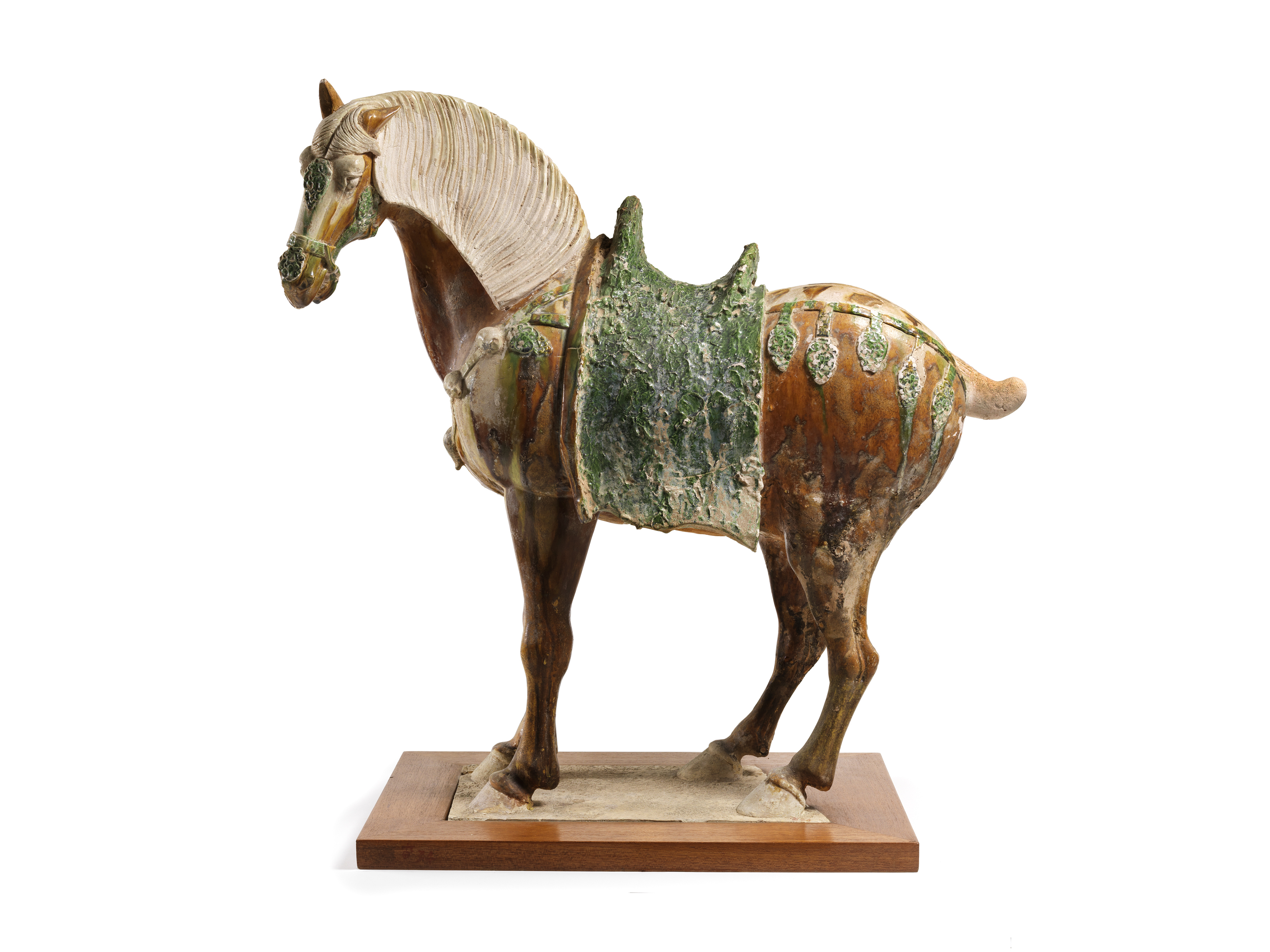 國立歷史博物館藏《三彩馬》(館藏編號h0000030),此件唐代三彩馬直立於平板上,頭略向左偏,低首靜立,姿態優雅。頭前馬鬃分纓,頸背鬃毛梳剪整齊,馬首配戴絡頭,額飾當盧,攀胸及鞧帶均有鈴鐺及杏葉飾物,馬背配鞍,其上舖有毛毯,縛尾上翹,裝飾極為華麗,馬身整體施以黃褐釉,馬具、垂飾、鞍褥等以綠釉為主,馬鬃殘留白釉,馬尾則無釉,釉色鮮麗,整體比例正確,體型健碩勻稱、四肢細挺有力,適切表現其雄偉英姿。此件為1956年經教育部撥交予本館典藏,原為中國河南博物院典藏文物,2010年經文化部公告為重要古物。