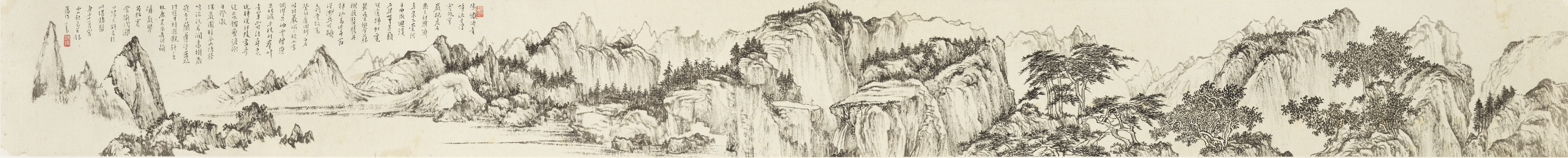 溥心畬以唐寅為基礎,揉合了元代四家的用筆、造型、及水墨長卷的構圖,寫出這一幅紙面雖小但場面壯闊,起伏有致的畫作。氣勢一貫,結構緊勁連綿,直到最後一小段,仍然威力不減。此作詩、書、畫三絕,為本館收藏極重要之溥心畬畫作。