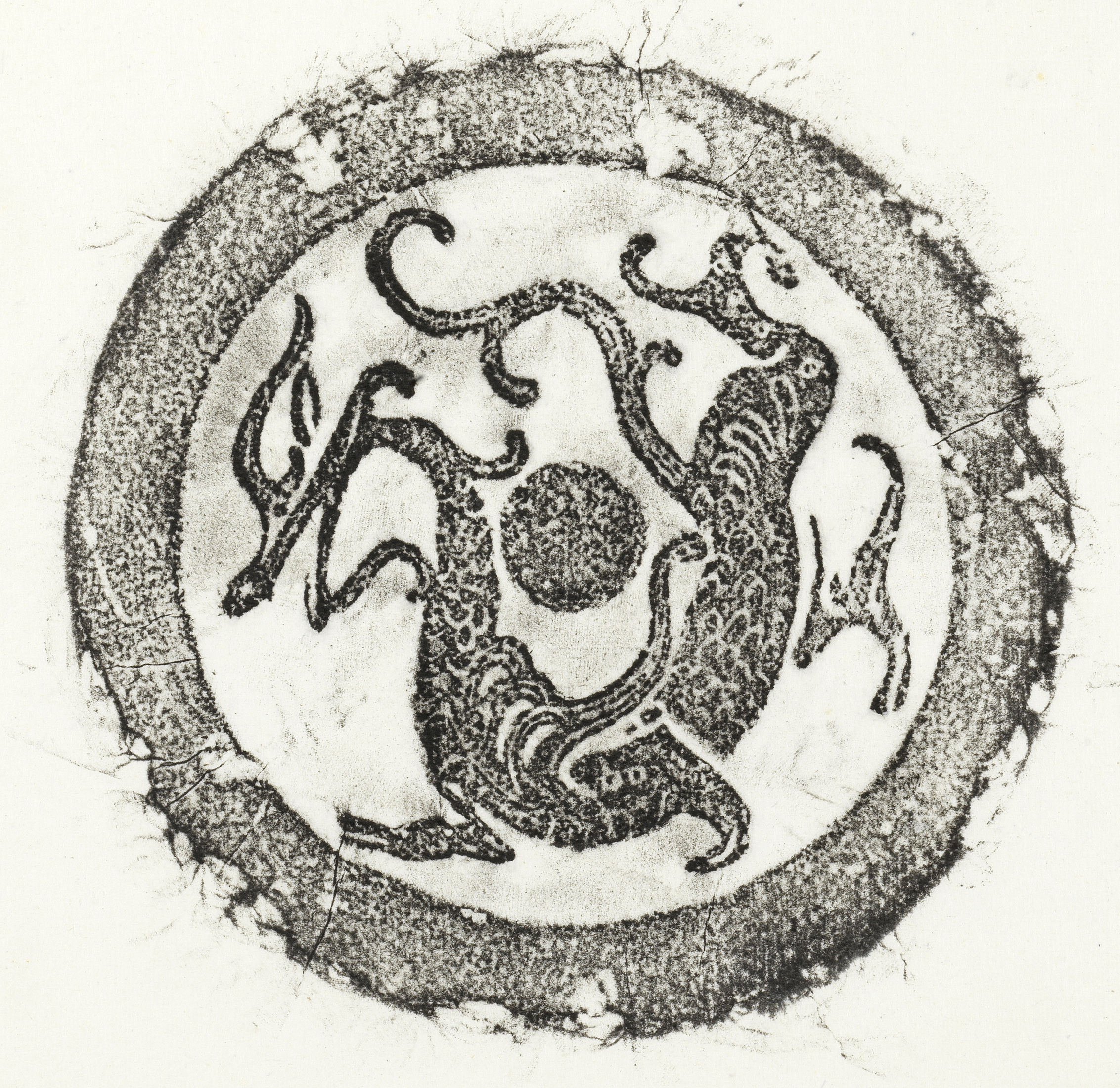 國立歷史博物館藏《漢青龍瓦當拓本》(館藏編號78-00012),此圖像是拓印漢代陶製瓦當表面上的圖樣,圖像中龍尾高揚,騰空飛舞。古代傳說龍能興雲致雨、調和陰陽,也被認為是神仙的座騎,在《山海經》的〈海外西經〉、〈海外北經〉、〈海外東經〉等諸篇中,神人乘龍的記述俯拾皆是。瓦當是古代中國建築屋檐上最前面的圓形瓦,位於筒瓦之前用來保護木製屋檐,以防日曬雨淋,兼具排水、美化建築的實用功能。漢代瓦當以灰陶為主,瓦當上常模印文字、圖案。古人把東、西、南、北、中分別用青、白、赤、黑、黃五種顏色相配屬,以青龍、白虎、朱雀、玄武等四種動物代表四方,稱之為「四神紋」或「四靈紋」。《三輔黃圖》謂:「蒼龍、白虎、朱雀、玄武,天之四靈,以正四方。」青色即是蒼色,所以「青龍」又稱「蒼龍」。王莽時期「青龍」、「白虎」、「朱雀」、「玄武」為瓦當上最具代表性的圖像。