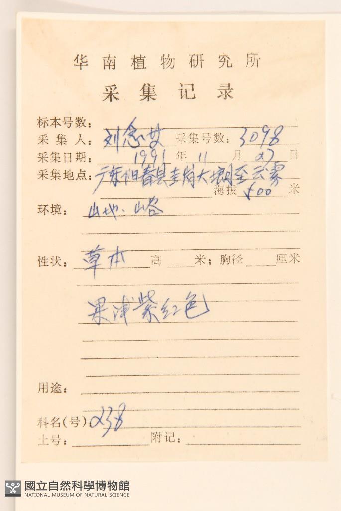 Collector's No.:劉?3098