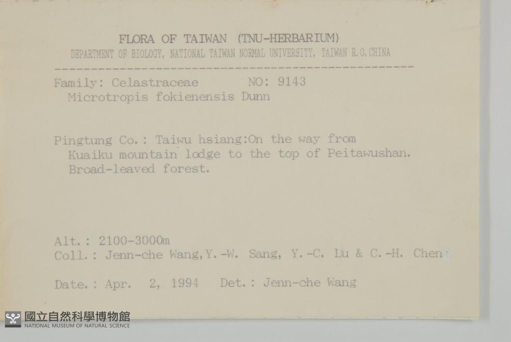 Collector:Jenn-Che Wang (王震哲), Yu-Wen Sang (桑于雯), Yu-Chuan Lu (呂玉娟), & al.