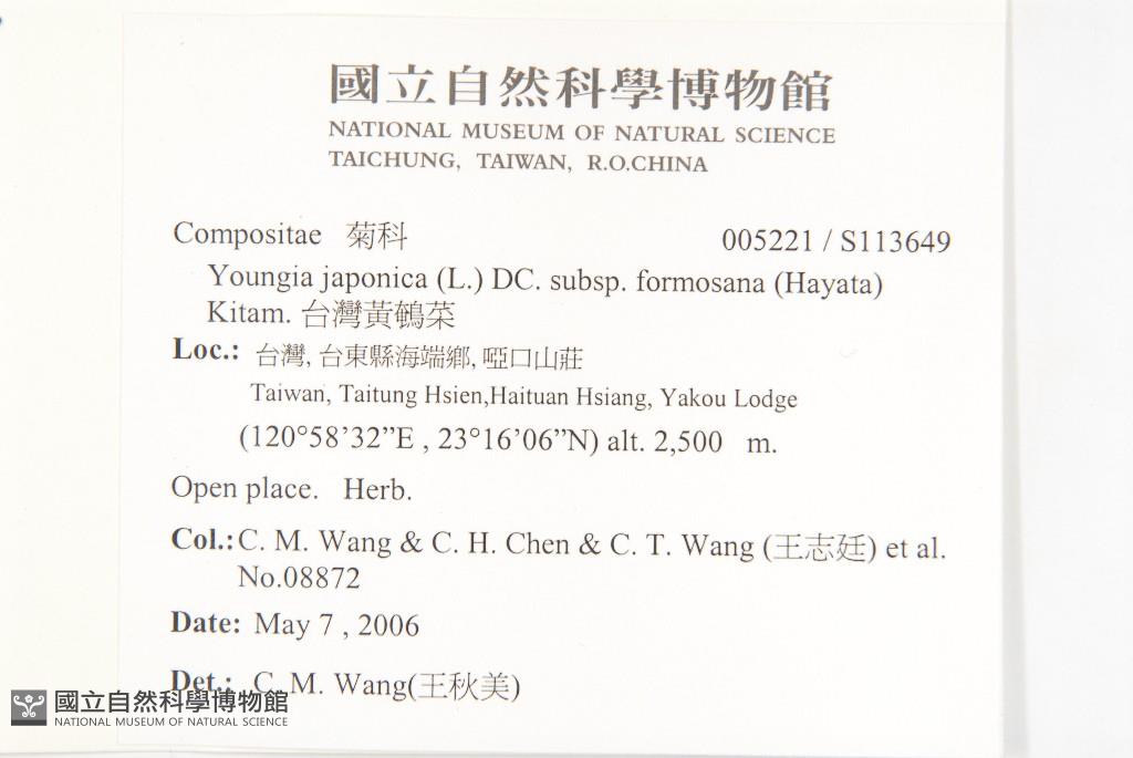 Collector:Chiu-Mei Wang (王秋美), & Chih-Hsiung Chen (陳志雄) & C. T. Wang (王志廷), & al.