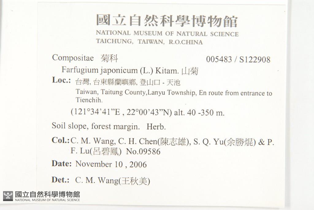 Collector:Chiu-Mei Wang (王秋美),Chih-Hsiung Chen (陳志雄), Sheng-Kun Yu (余勝焜) & al.