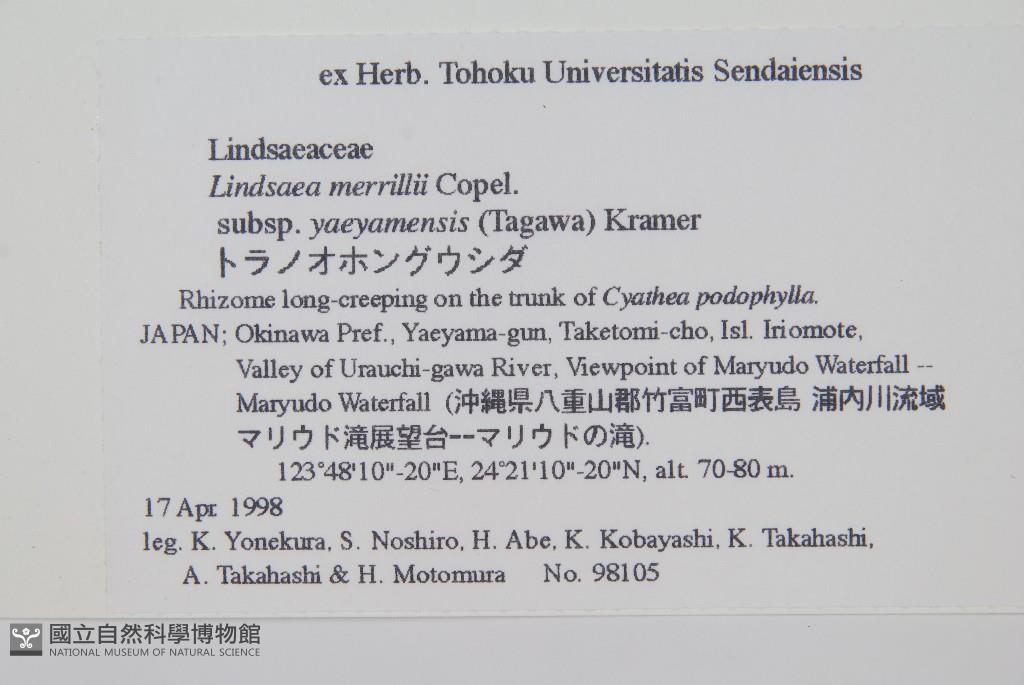 Scientific Name: Lindsaea merrillii Copel. subsp. yaeyamensis (Tagawa) Kramer