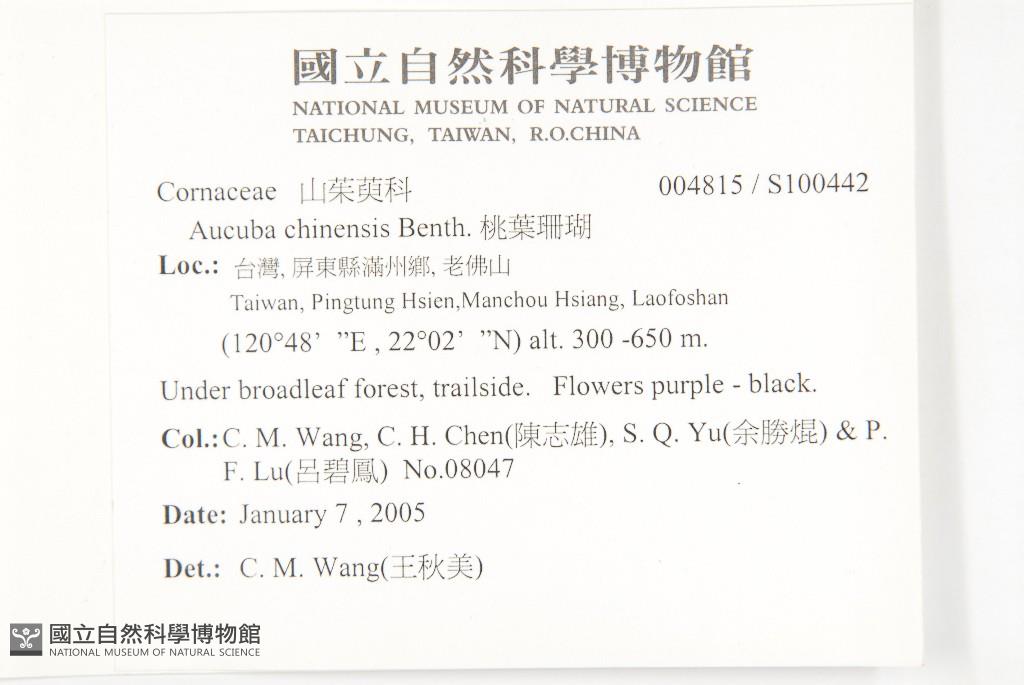 Collector:Chiu-Mei Wang (王秋美),Chih-Hsiung Chen (陳志雄), Sheng-Kun Yu (余勝焜) & al.