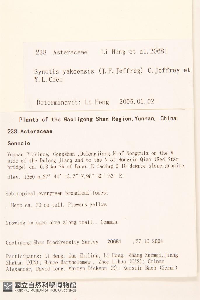 Scientific Name: Synotis yakoensis (Jeffrey ex Diels) C.Jeffrey & Y.L.Chen