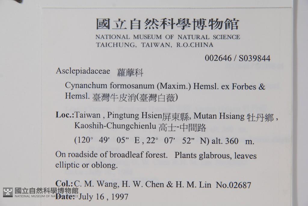 Scientific Name: Cynanchum formosanum (Maxim.) Hemsl. ex Forbes & Hemsl.