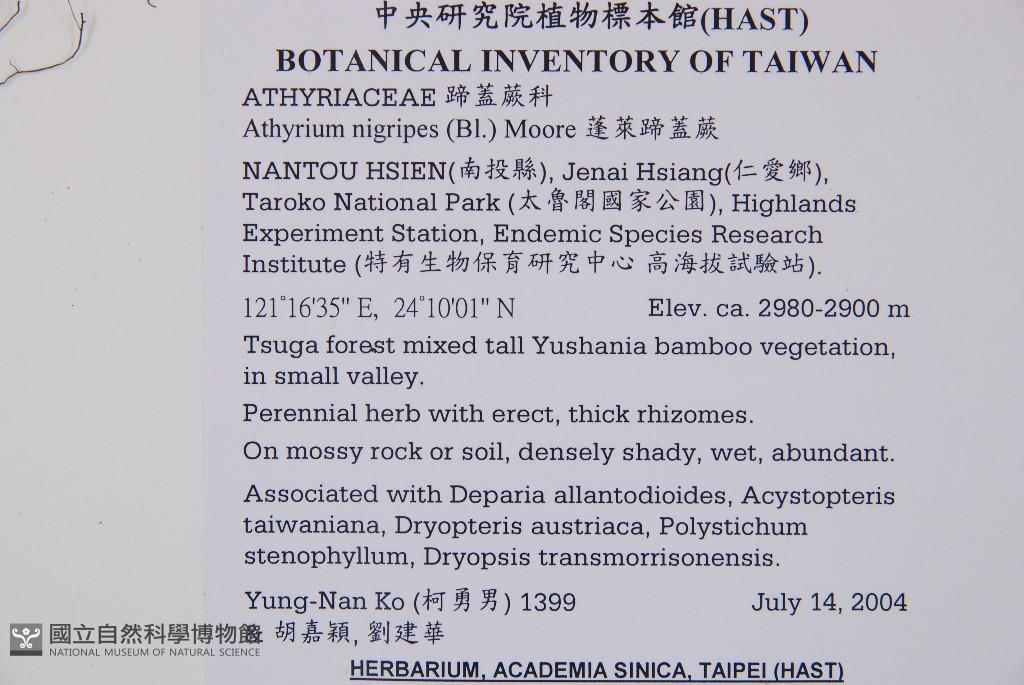 Locality:Nantou County, Jenai Township Taroko National Park, Highlands Experiment Station, Endemic Speciies Research Institute.