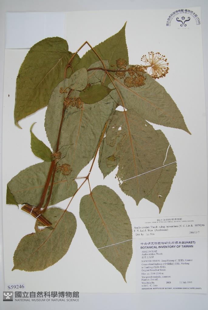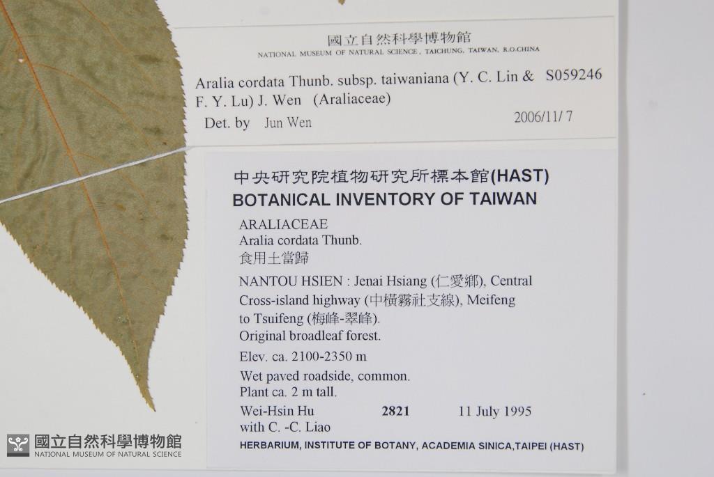 Scientific Name: Aralia cordata Thunb. subsp. taiwaniana (Y. C. Lin & F. Y. Lu) J. Wen