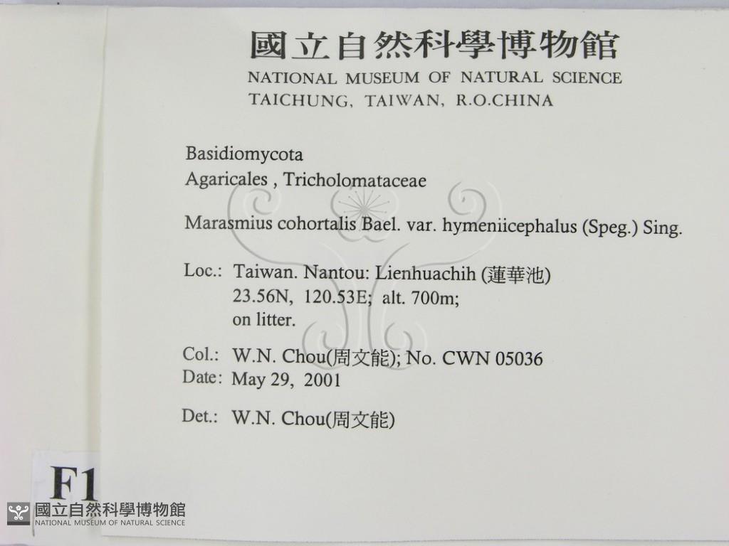 Marasmius cohortalis Bael. var. hymeniicephalus (Speg.) Sing.