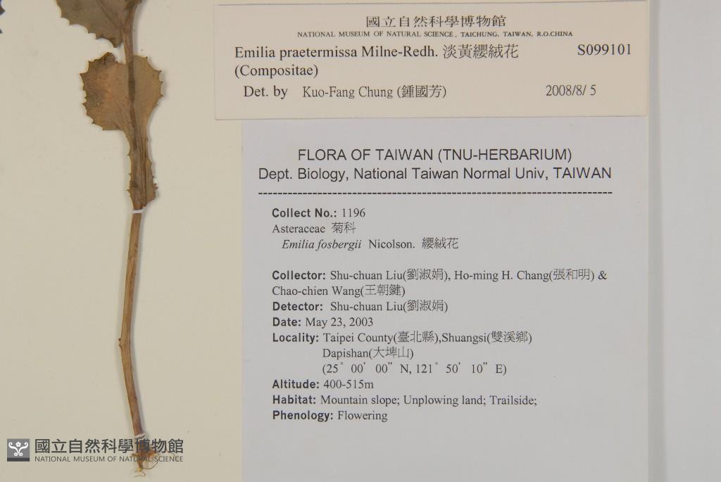 Collector:Shu-chuan Liu(劉淑娟), Ho-ming H. Chang(張和明) & Chao-chien Wang(王朝