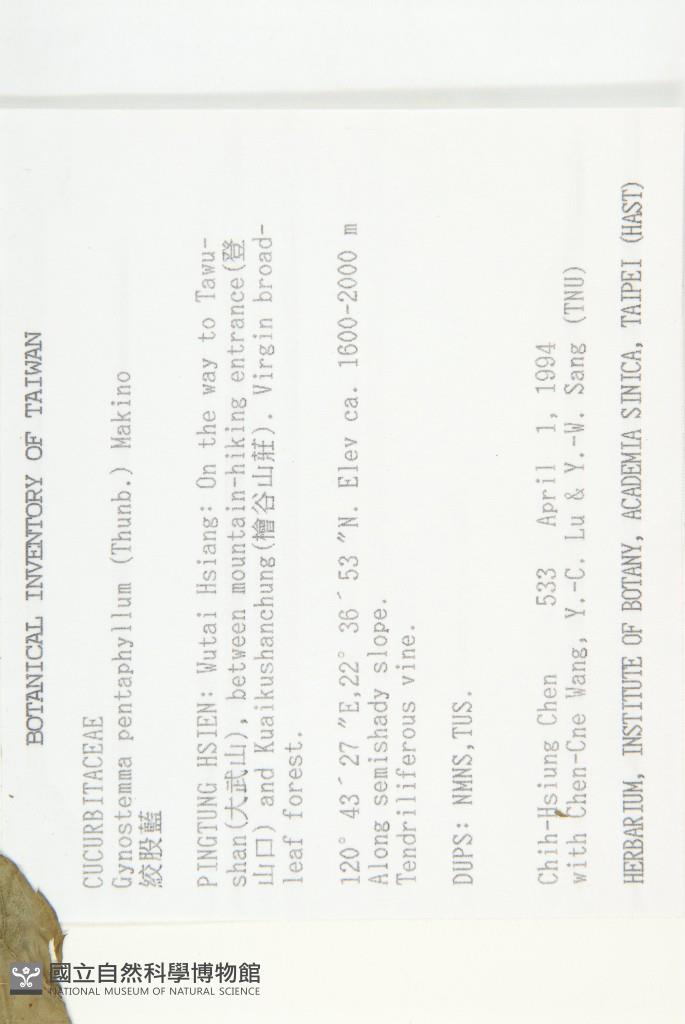 Collector:Chih-Hsiung Chen (陳志雄), Jenn-Che Wang (王震哲), Yu-Chuan Lu (呂玉娟), Yu-Wen Sang (桑于雯)