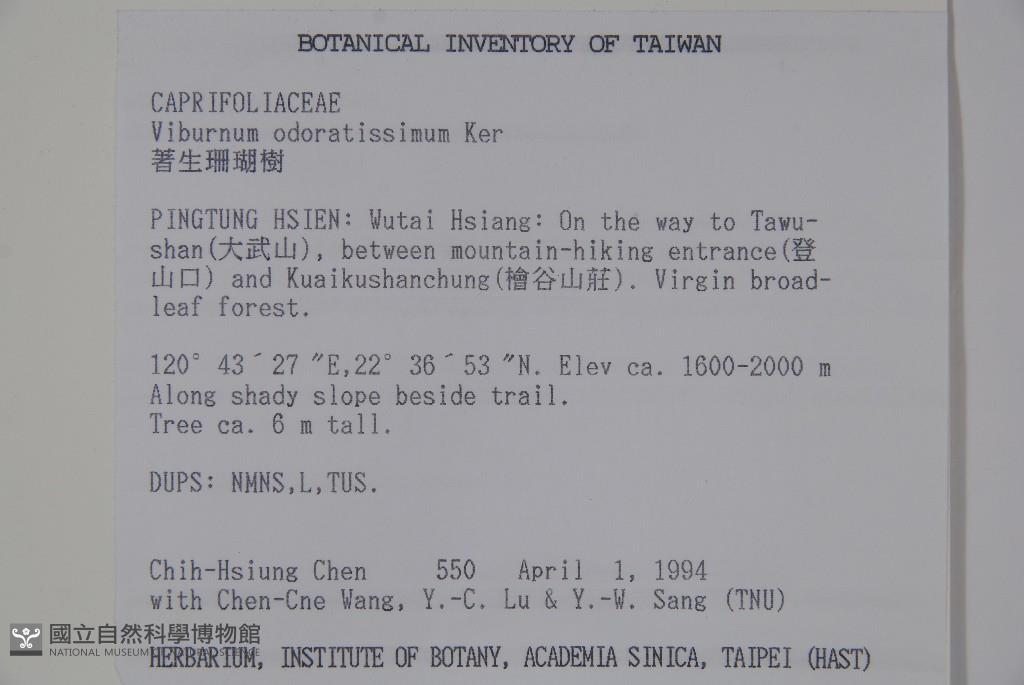 Collector:Chih-Hsiung Chen (陳志雄), Jenn-Che Wang (王震哲), Yu-Chuan Lu (呂玉娟), Yu-Wen Sang (桑于雯)