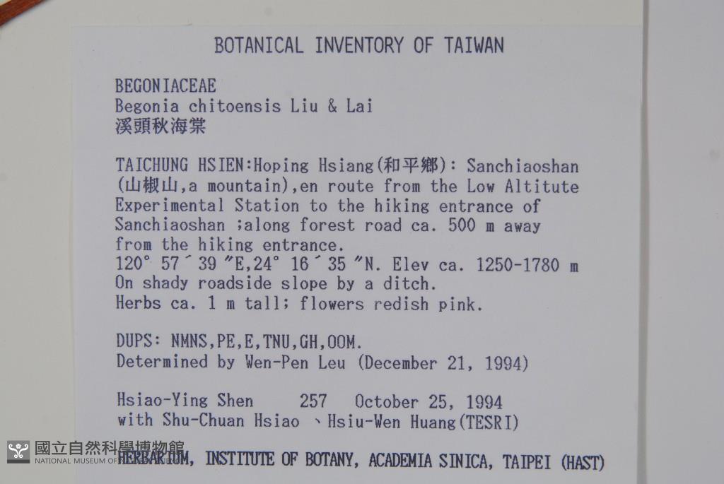 Scientific Name: Begonia chitoensis T.S.Liu & M.J.Lai
