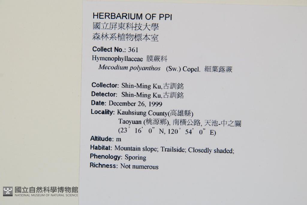 Locality:Kaohsiung County, Taoyuan Township South-Cross Highway, Chungchihkuan-Tienchih