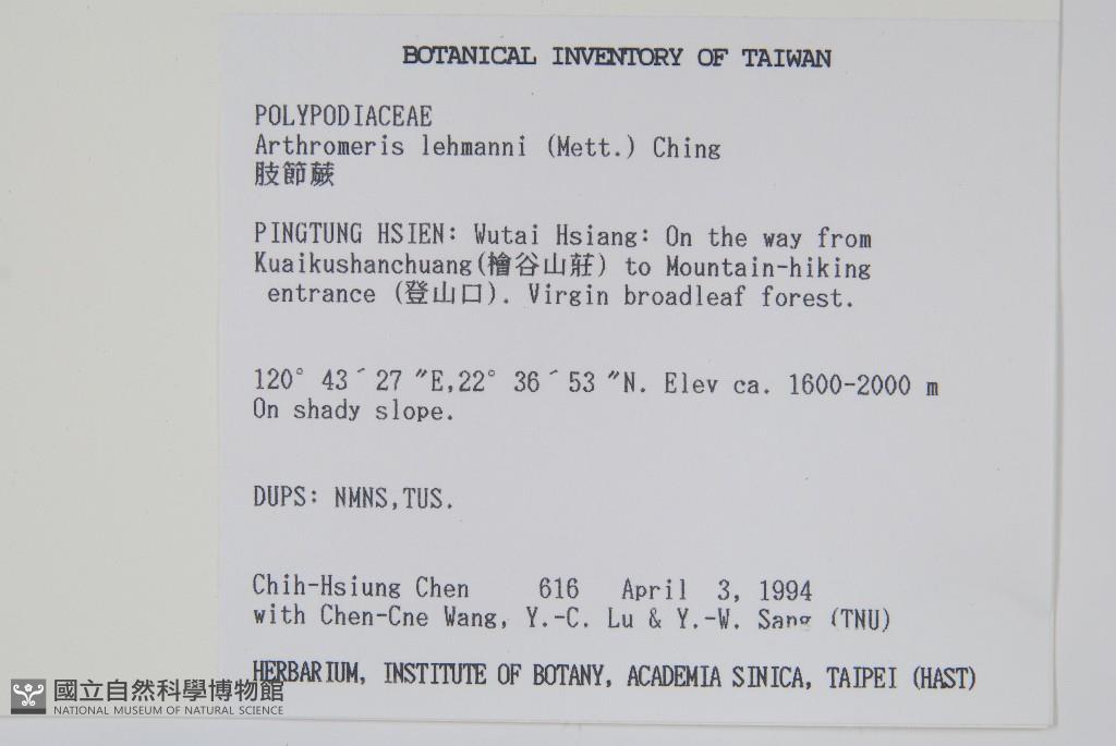 Collector:Chih-Hsiung Chen (陳志雄), Jenn-Che Wang (王震哲), Yu-Chuan Lu (呂玉娟), Yu-Wen Sang (桑于雯)