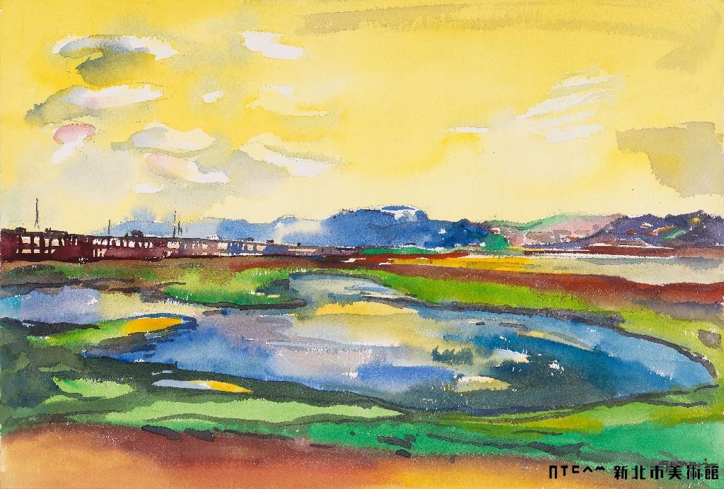 Introduction:This is a watercolor landscape by Lee Quan-pui. Judging from the title and the rolling mountains in the distant background, the painter probably created his composition from the view overlooking the Linkou Plateau and the Wugu Interchange. Using vibrant colors like yellow, blue, and green, together with techniques of dry and wet washes and blending, Lee expresses a refreshing and bright suburban scenery. Different from other landscapes featuring Wugu in the past, which mostly depicted farmlands, riverbanks, and distant mountains, Lee chose the National Highway No. 1, one of the “Ten Major Construction Projects” in the 1970s, and the Wugu Interchange. In the painting, the modern highway and the redbrick low-rises in the background constitute a contrast between the old and the new.