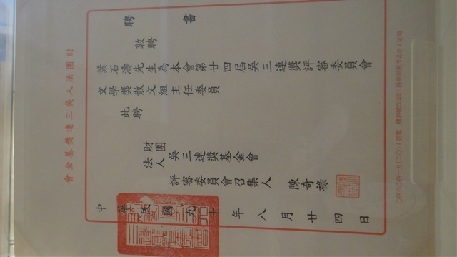 聘書-第二十四屆吳三連獎評審委員會文學獎散文組主任委員