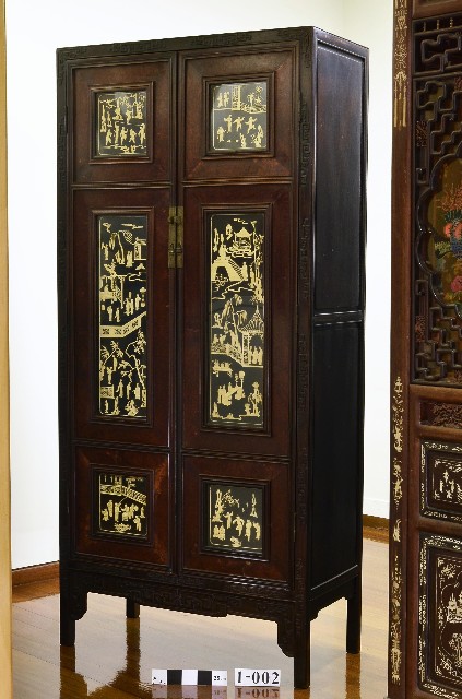 清式紅木雕花加櫻木嵌海象牙雕紅樓夢人物方角櫃
