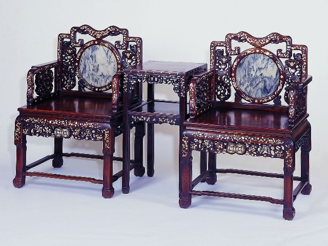 清式酸枝雕花嵌螺鈿雲石太師椅組