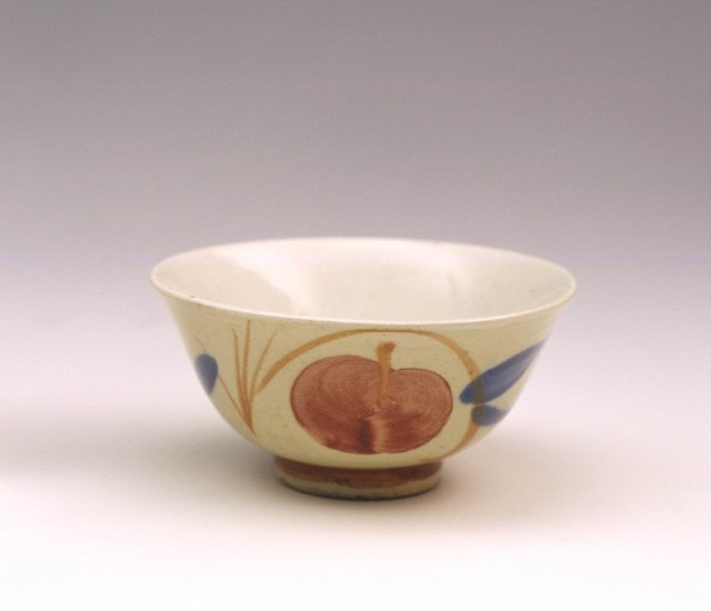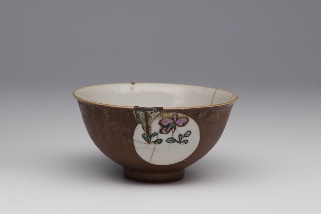 內白外褐開光花草紋小碗